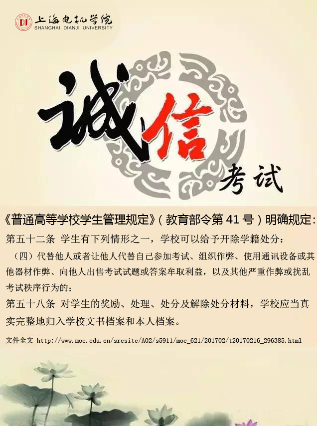 诚实守信是中华民族的优良传统,也是公民道德的基本要求。端正考试态度、诚信参考、坚决杜绝作弊行为,做一名文明诚信的老员工,展现电机优良学风