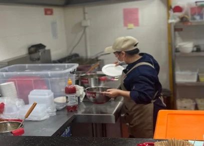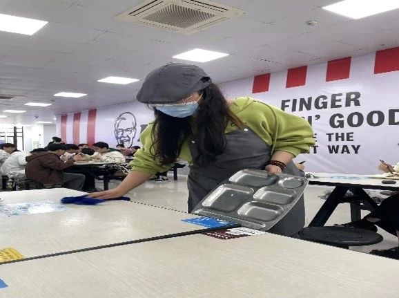 图中,食堂里的工作人员们精心准备着美味的饭菜,让师生们在忙碌的学习和工作后能享受到可口的饭菜。